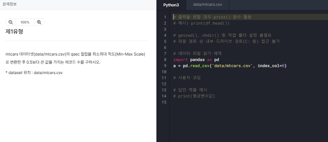 실제 시험 환경을 확인할 수 있는 곳에서 나오는 문제를 풀어보면서 감을 익혀보려고 합니다. 빅데이터 분석기사에서 쓰는 라이브러리가 생각보단 많지 않지만, 코딩을 처음하면 생각보다 복잡할 수 있습니다.
